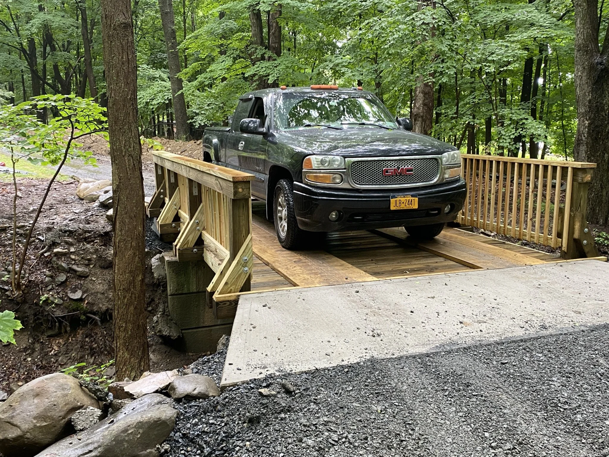 This project comprised design-build of a small 25 ft residential access bridge. Our firm evaluated the existing bridge and determined that it was close to failure. We designed, permitted, and constructed the steel & timber bridge shown in the photos, which included the removal and demolition of the existing structure.